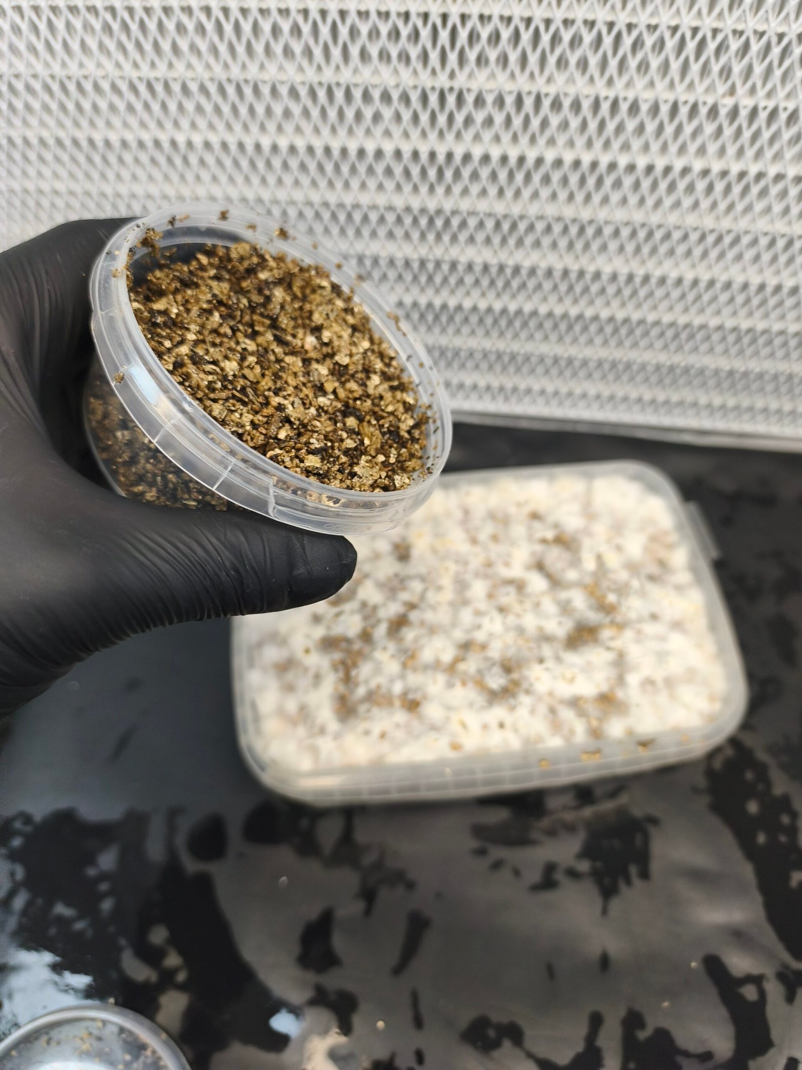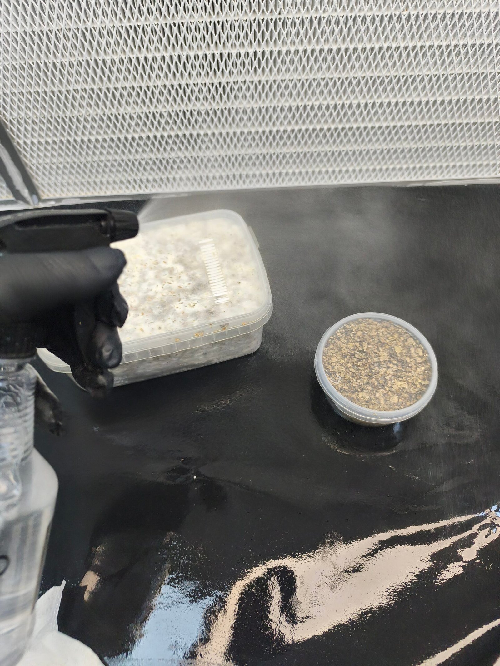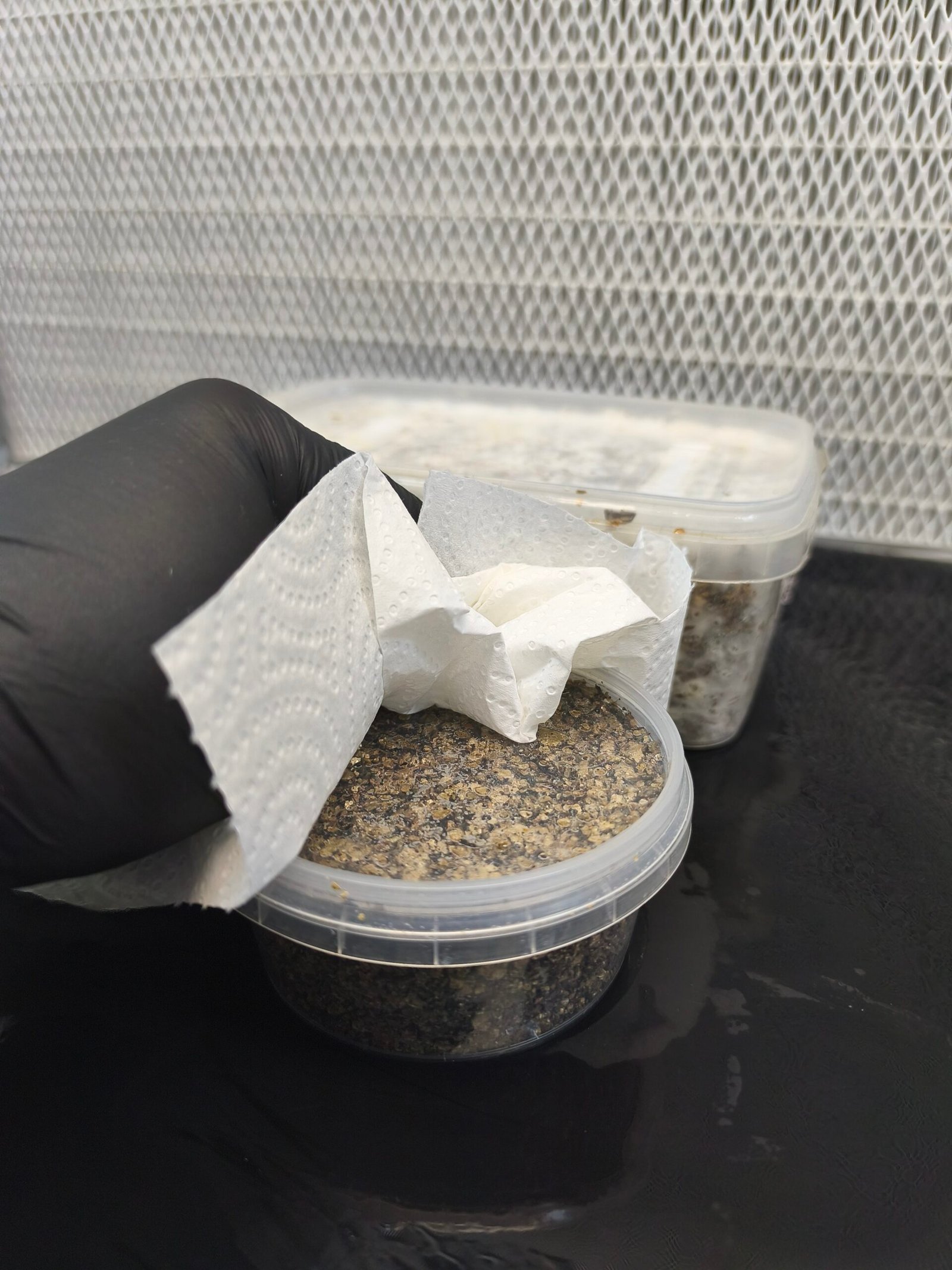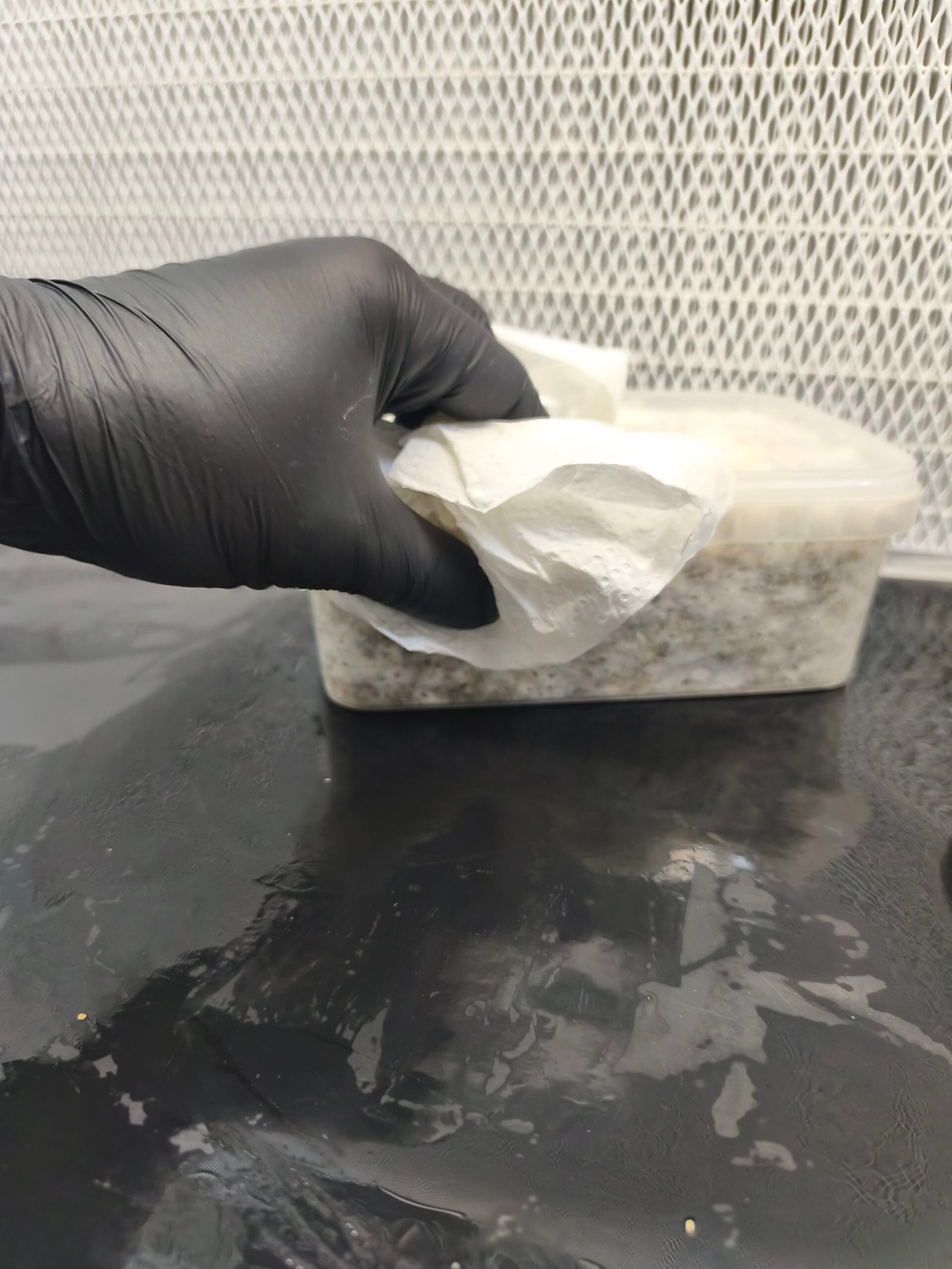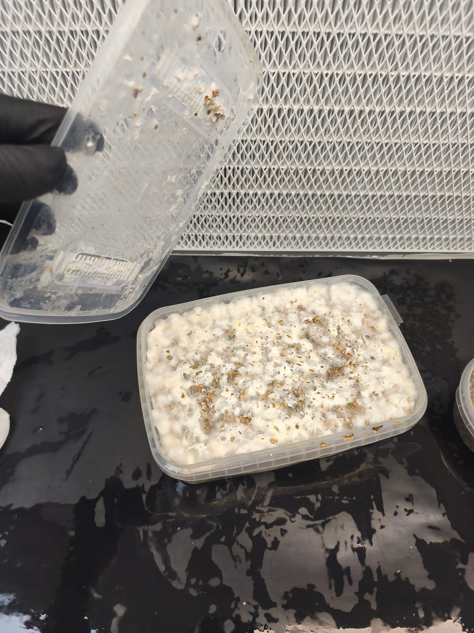 Retira la tapa del tupper, enjuagala con agua filtrada y resérvala para posteriores ciclos de fructificación.