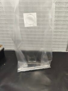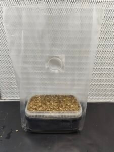 Introduce el tupper destapado en la bolsa transparente proporcionada,pulveriza las paredes de la bolsa, ciérrala haciendo un par de dobleces o tres y pon los clips.Hasta que no salgan los primordios puedes dejarla así o abrir para ventilar cada 3-4 días,pero el filtro que tiene es suficiente para el intercambio gaseoso.