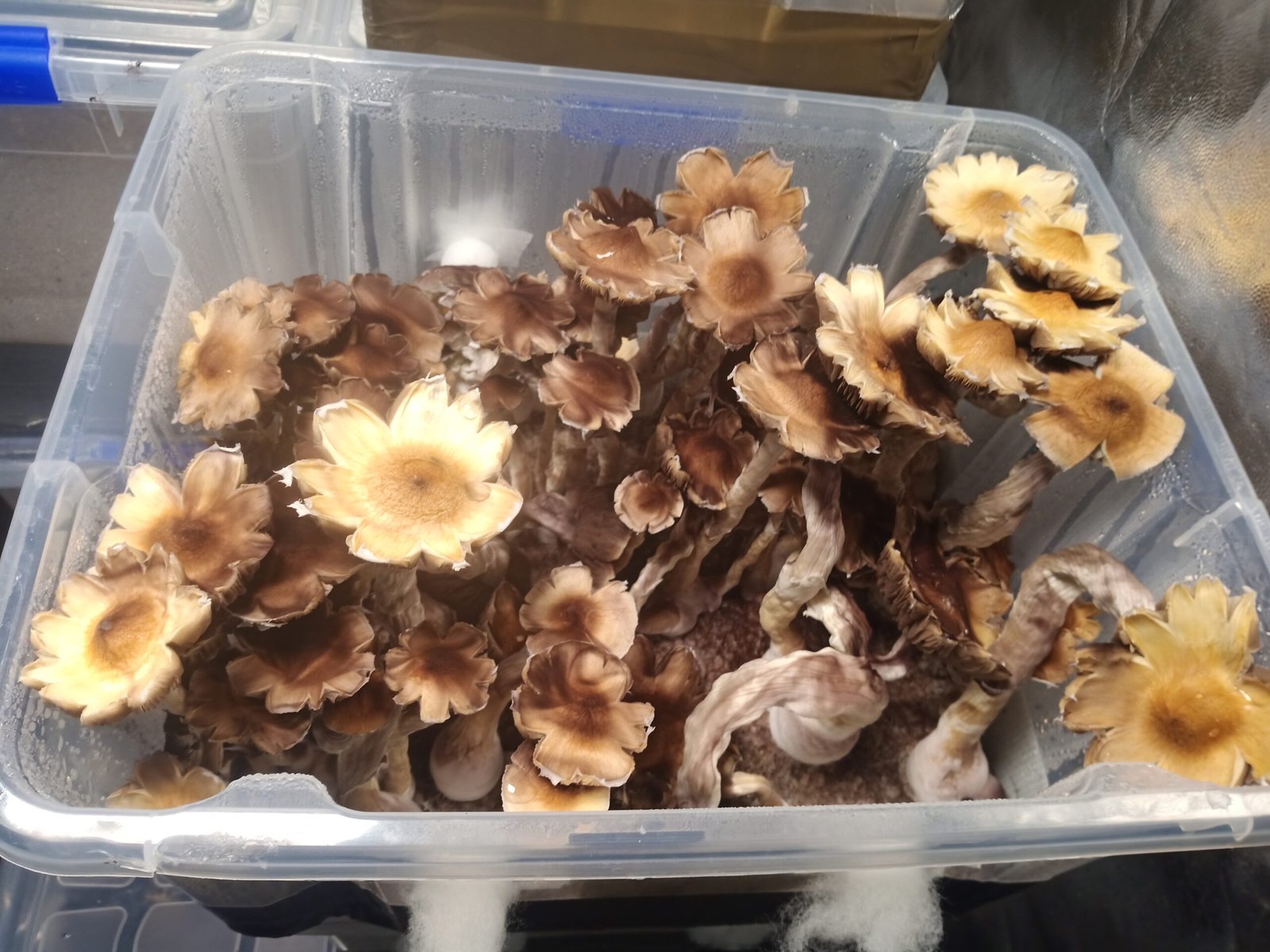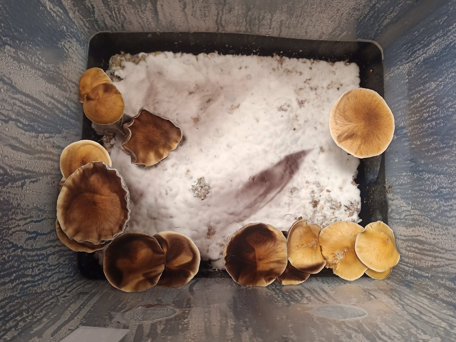 Ventila la caja si ves que hay mucha humedad, atomiza con agua del grifo mezclada con un poco de agua oxigenada por las paredes si ves que hay poca, la humedad en punto debe de estar en el 85% más o menos. Nunca eches el agua por encima de las setas, atomiza las paredes del tupper.