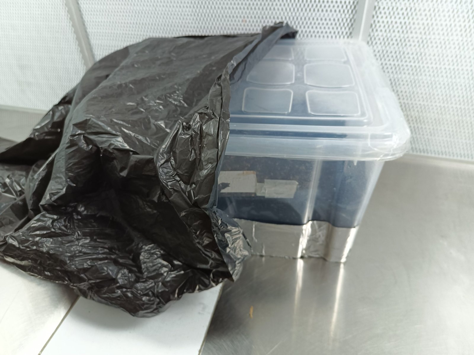 Con cinta de aluminio o cualquier otra cinta que sea opaca, (recomiendo cinta americana de la fuerte, así cuando lavemos la caja de plástico para futuros bulk, no se despegara), tapamos la parte de abajo y entre 8-10 centímetros por el fondo y los lados (hasta donde llegue la mezcla con el grano y el sustrato), esto es para evitar que entre luz por debajo y por los laterales y así nos salgan todas las setas por la parte de arriba, ya que si salieran por abajo podrían pudrirse y contaminar todo el cultivo, esto te lo puedes evitar usando una bolsa de basura dentro de la caja y echando el sustrato dentro, no lo recomiendo si no tienes unas condiciones buenas de higiene y desinfección, ya que meter una bolsa o cualquier cosa dentro del tupper, aumentara las probabilidades de contaminación de tu bulk.