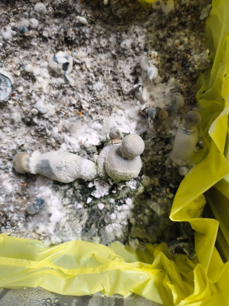 Rápidamente el micelio colonizará todo el sustrato y pronto emergerá un bosque de pequeños cuerpos fructíferos. Esta técnica, supera a cualquier otro método casero cuando se trata de producción. Además el monotub o bulk permite a los productores concentrar todos sus esfuerzos en una sola estructura, en comparación, jugar con panes de micelio separados y cámaras de cultivo requiere un esfuerzo considerablemente mayor.