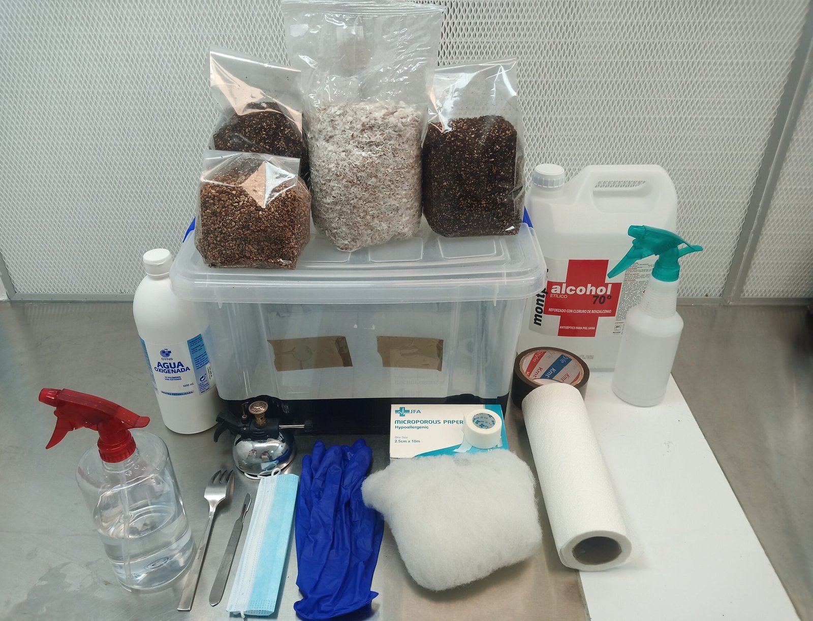 Desinfecta con alcohol u otro desinfectante cada utensilio que vayas a utilizar, así como las bolsas de micelio y de sustrato.